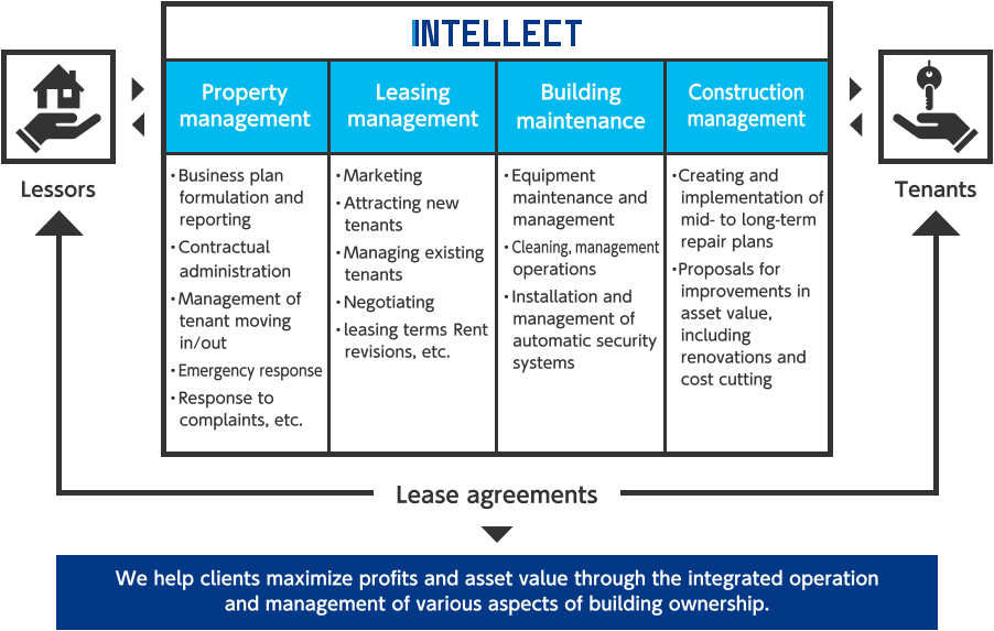 Through an integrated approach to real estate operations management combining PM with building maintenance (BM), we provide high quality services for both tenants and property owners.