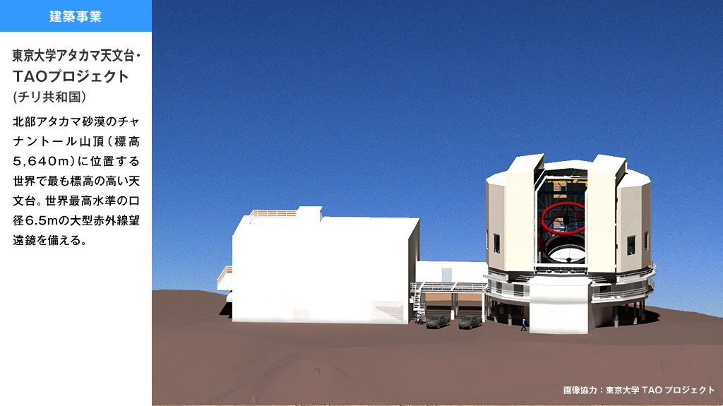 CM(コンストラクション・マネジメント)を主とした設計コンサルタントの仕事を担当しています。全国各地での建設業務における、条件に合う土地の選定からコスト算出、施設のデザインなど、プロジェクトの起案から業務の全体を統括する仕事に取り組んでいます。また、南米チリに世界一の天文台を建設するTAOプロジェクトにも関わっており、二度できない体験に達成感を得ています。